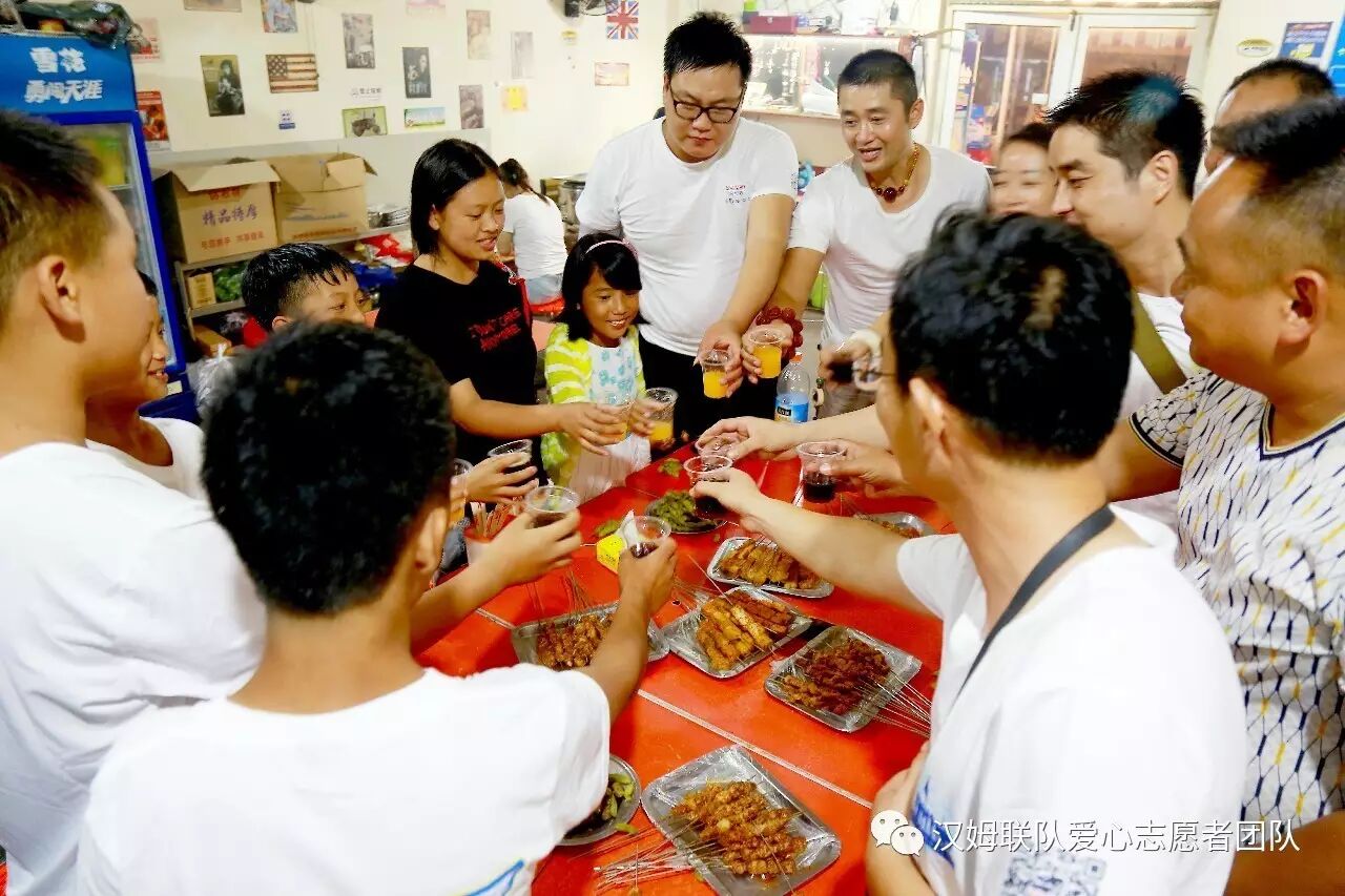 洗漱完毕。志愿者蔡松邀请孩子们来到自己的烧烤店吃宵夜。蔡松说:“孩子们来一次不容易,为他们准备一餐地道的徐州烧烤,这可是咱的荣幸!”